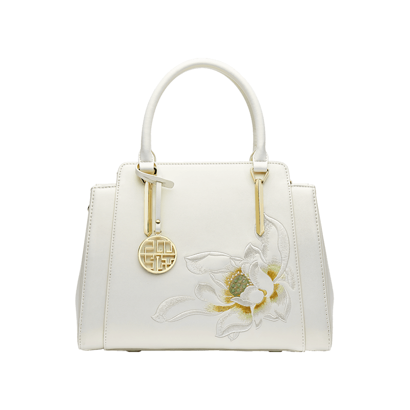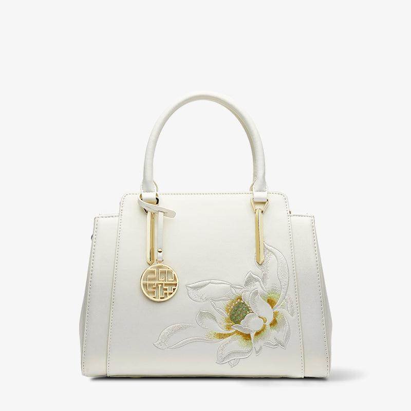 Sinocultural Embroidery Leather Tote Bag White Lotus Crossbody Bag